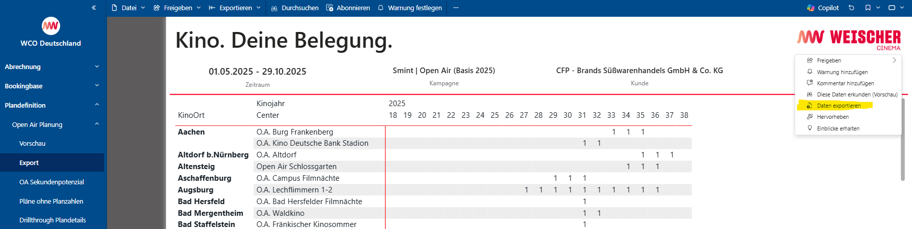 Oben rechts könnt Ihr in PowerBI sehen, wann der letzte Import statt gefunden hat - im Screenshot war dies z.B. am 21.01.2026. - Geht auf Plandefinition>>Open Air Planung>>Export und klickt oben rechts auf die 3 Punkte und dann auf "Daten exportieren"